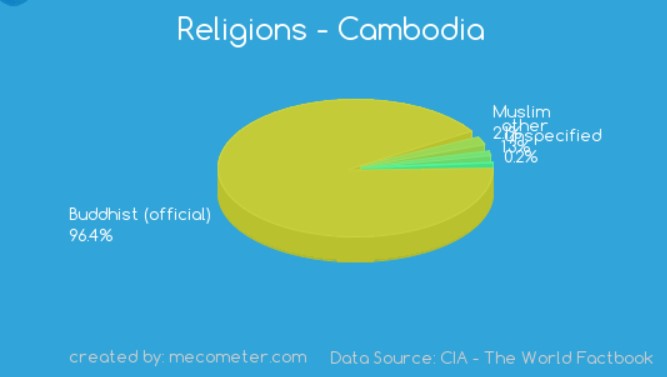 Buddhism in Cambodia has existed since at least the 5th century. In its earliest form it was a type of Mahāyāna Buddhism. Today, the predominant form of Buddhism in Cambodia is Theravada Buddhism. It is enshrined in the Cambodian constitution as the official religion of the country. Population of Cambodia is around 16 Million.