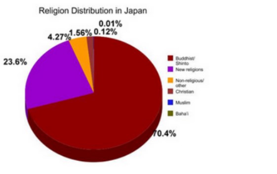 Population of Japan is around 127 Million. In modern times, Japan’s popular schools of Buddhism are Pure Land Buddhism, Nichiren Buddhism, Shingon Buddhism and Zen. However, in terms of practice, 75% practice some form of Buddhism (compared with 90% practicing Shinto, thus most Japanese practice both religions to some extent (Shinbutsu-shūgō)). Around 70 % of Japanese are Buddhist.